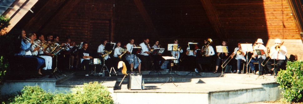 Wenn sich Bläser und Bläserinnen aus der EKHN samt Anhang wieder einmal auf den Weg machen, dann ist es wieder einmal Zeit für die Bläserfamilienfreizeit der EKHN unter der Leitung von Johannes Kunkel. Im dreijährigen Turnus war dieses Jahr Lechbruck im schönen Allgäu an der Reihe. Mit viel Wiedersehensfreude begrüßten wir alte Hasen uns und adoptierten kurzerhand alle Neuzugänge. Während die Eltern ihre Kinder bei der inzwischen zum Inventar gehörenden Erzieherin wussten, konnte mit aller Energie geprobt werden. Auf dem Programm standen Einblasübungen mit ommamas und gammarabas. Im Hauptteil der Probe studierten wir Bläservorspiele und Choräle ein für zwei Gottesdienste in der Lechbrucker evangelischen Kirche. Den zweiten Gottesdienst gestalteten wir gemeinsam mit Manfred Glowatzki (ehemaliger Landesposaunenwart in Braunschweig) an der Orgel.Der größte Teil der Probenarbeit galt der Vorbereitung der Serenade, die auch dieses Jahr in der Konzertmuschel am Lech stattfand. Wir gestalteten ein buntes Programm mit barocker Musik wie der Gavotte von Ph. H. Erlebach und einer Motette von Claudio Monteverdi , beide aus dem neuen Hessischen Bläserheft 2000. Doch auch fetzige Bearbeitungen wie Go tell it on the mountain und andere Spirituals (aus Life von Oliver Groenewald) standen auf dem Programm. Nicht unerwähnt bleiben sollten die Stücke aus dem Spielheft zwo drei vier, hier hatten vor allem die Kinder viel Spaß - hier kamen ihre Hits-Pipi Langstrumpf und Lummerlandlied. Immerhin waren wir während der Proben so fit geworden, daß wir während der Serenade auch ein Stück ohne Dirigent spielen konnten. Dieser wurde mittendrin durch einen freundlichen, aber sehr pflichtbewussten Polizisten aufgefordert, seinen Pkw aus dem Halteverbot zu entfernen. (siehe Foto)