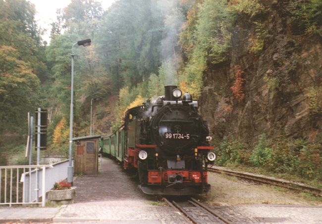 eine Dampflok der Sächsischen Schmalspurbahnen vorbei durch das Weißeritz-Tal.