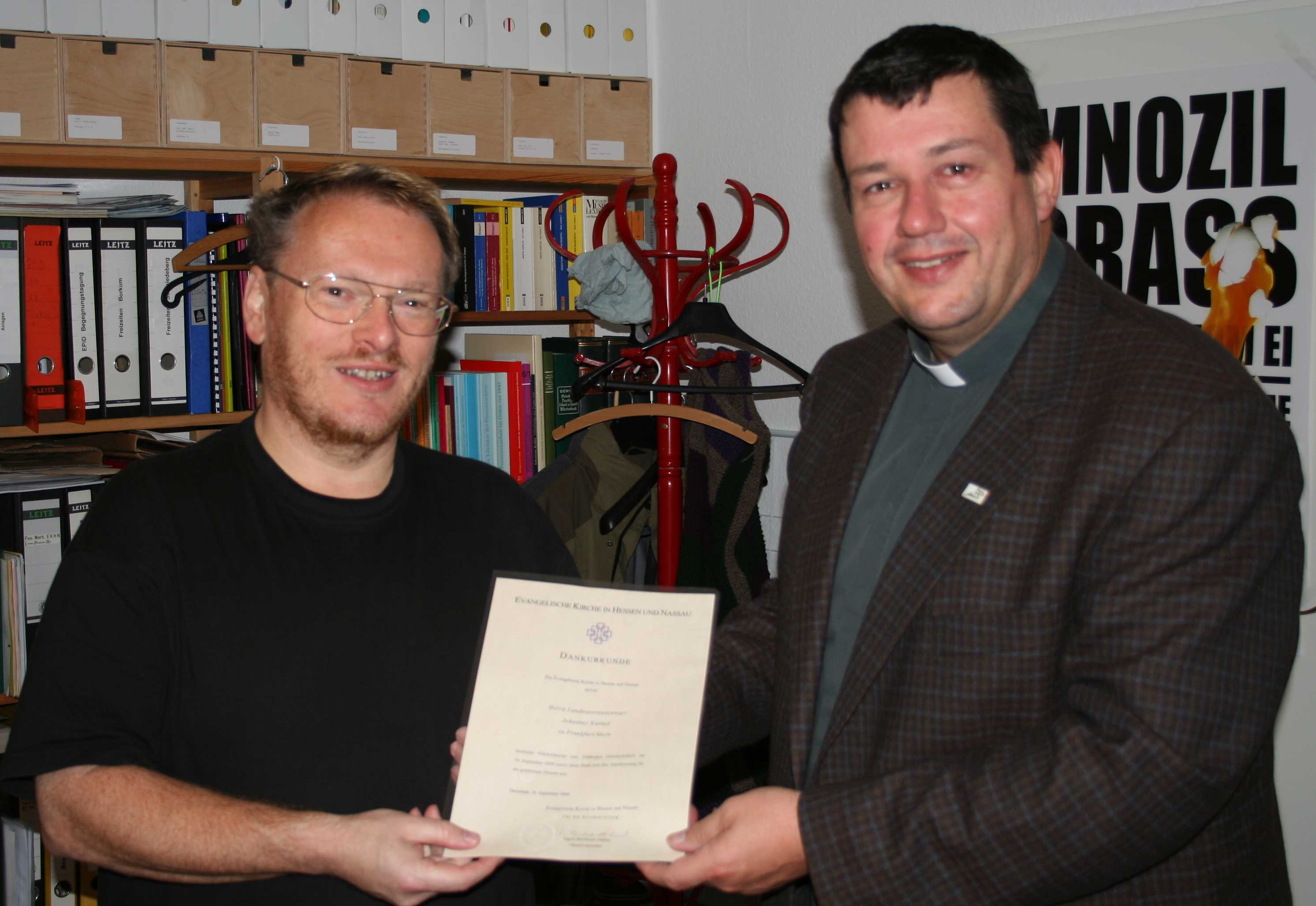 Volker Truschel überreichte die Dankurkunde der Evang. Kirche in Hessen und Nassau (s. Bild)